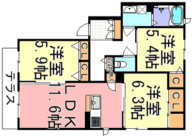 | 設備 | 散水栓/物干し/トイレ/玄関鍵(@キーAロック)/玄関鍵(ディンプルキー)/カラーモニタ付ドアホン/マルチメディア配管有/電話配管有/システムキッチン/独立キッチン/3口フラットコンロ/給湯器(追焚機能付)/給湯箇所(浴室・台所・洗面所)/24H換気システム/浴室乾燥機/洗髪洗面化粧台/洗濯機置場(室内)/トイレ(暖房洗浄便座)/クーラースリーブ有/しゃ熱断熱複層ガラス/クッションフロア/網戸/雨戸(シャッタータイプ)/ウォークインクローゼット/火災警報器(煙感知式)/火災警報器(熱感知式)/インターネット対応/eo光/ペット相談可(室内中型犬)/駐輪場(屋根付き)/他 | |||